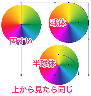 最初のパスの形が異なるだけで、やってることはほとんど同じ。球体・半球体でつくる場合は塗りのみにすると、面が少なくて済みます。お好みに合わせてご利用ください。