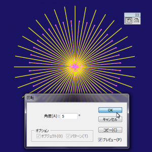 花火の線を増やすため、縮小コピーを行い、少し回転させていきます。